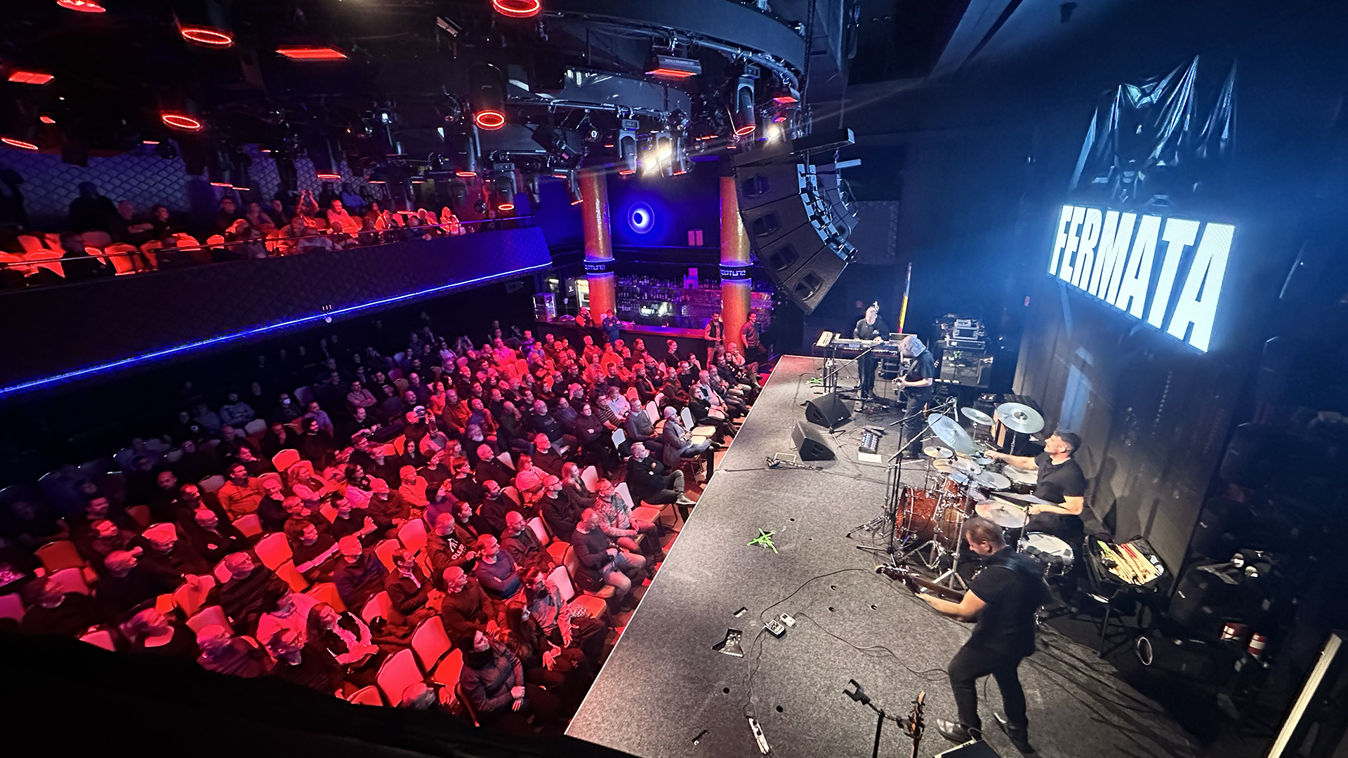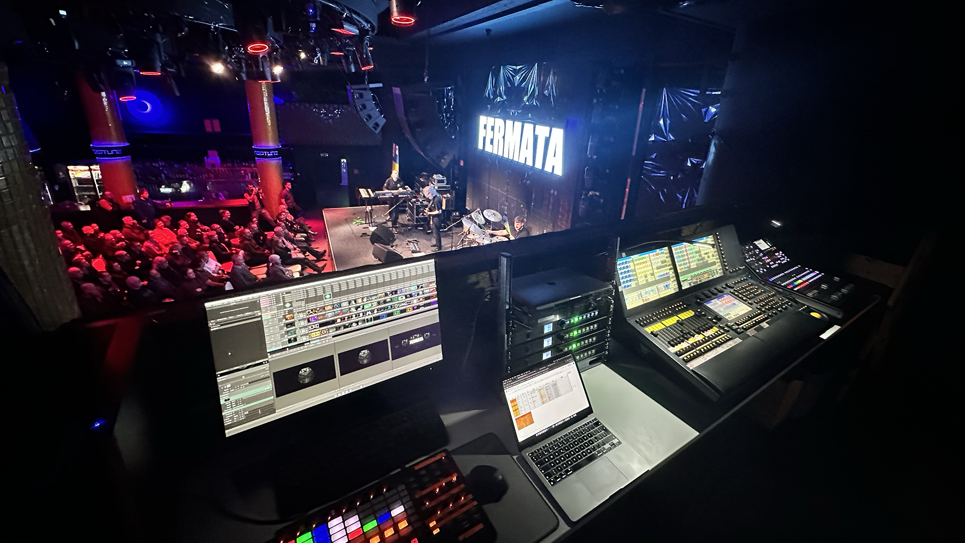 During the live performance of the band Fermata together with Martin Valihora at Neptune Club, we handled the playback of visual content across an extensive network of LED screens and configured the lighting system to match the dynamics of the concert. The venue features a large number of LED surfaces and lighting fixtures, requiring precise coordination of visuals and tailored technical adjustments for each output.