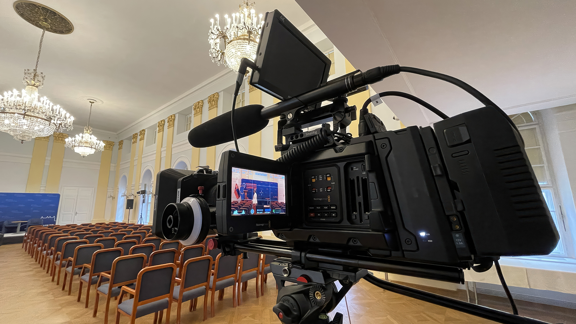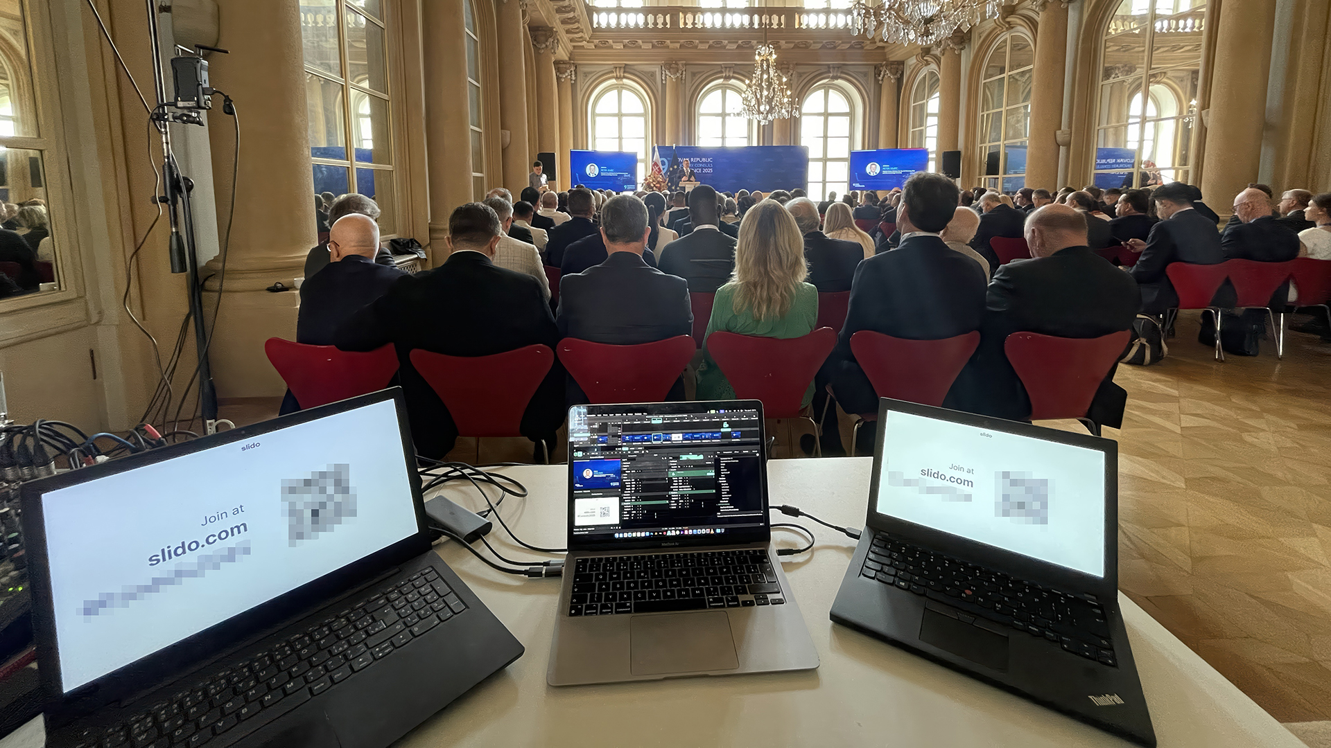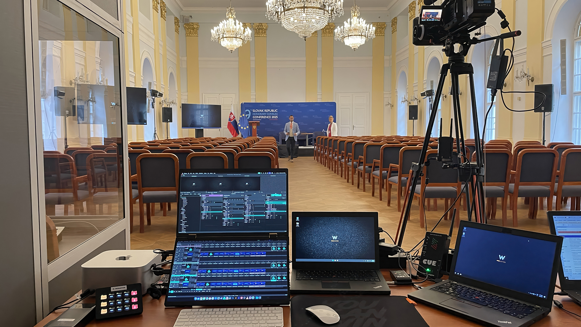 On the first day, production took place at the Historical Building of the National Council of the Slovak Republic, where we managed the live camera feed projected onto delay screens to ensure clear visibility of the stage for attendees seated further away. At the same time, presentation materials, Slido questions and additional visual content were distributed across dedicated display screens.